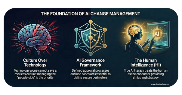 Technology alone won’t save a reckless culture. Implementing secure AI is a profound organisational transition that requires managing the “people-side” of the shift, alongside a formal AI Governance Framework to define approved tools, use cases, and review processes.