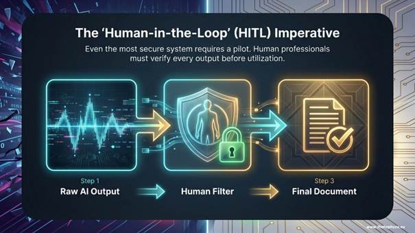 Even the most secure system requires a pilot. A “Human-in-the-loop” (HITL) approach is not optional—it is a fundamental requirement for accountability. AI systems can produce biased or inaccurate results; human professionals must verify every output before anything is utilised or published.