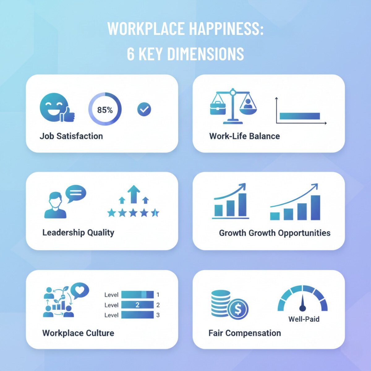 Take 3 minutes to discover your workplace happiness score across 6 key dimensions.